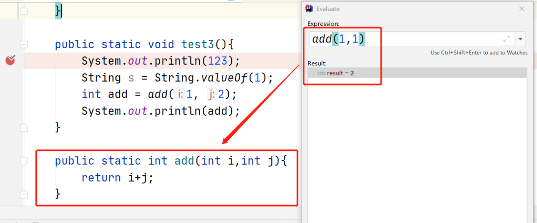 横 8:计算表达式,在 debug 模式中,可以直接输入当前类中的任意一个方法,直接进行运算,输出结果,如下图所示。