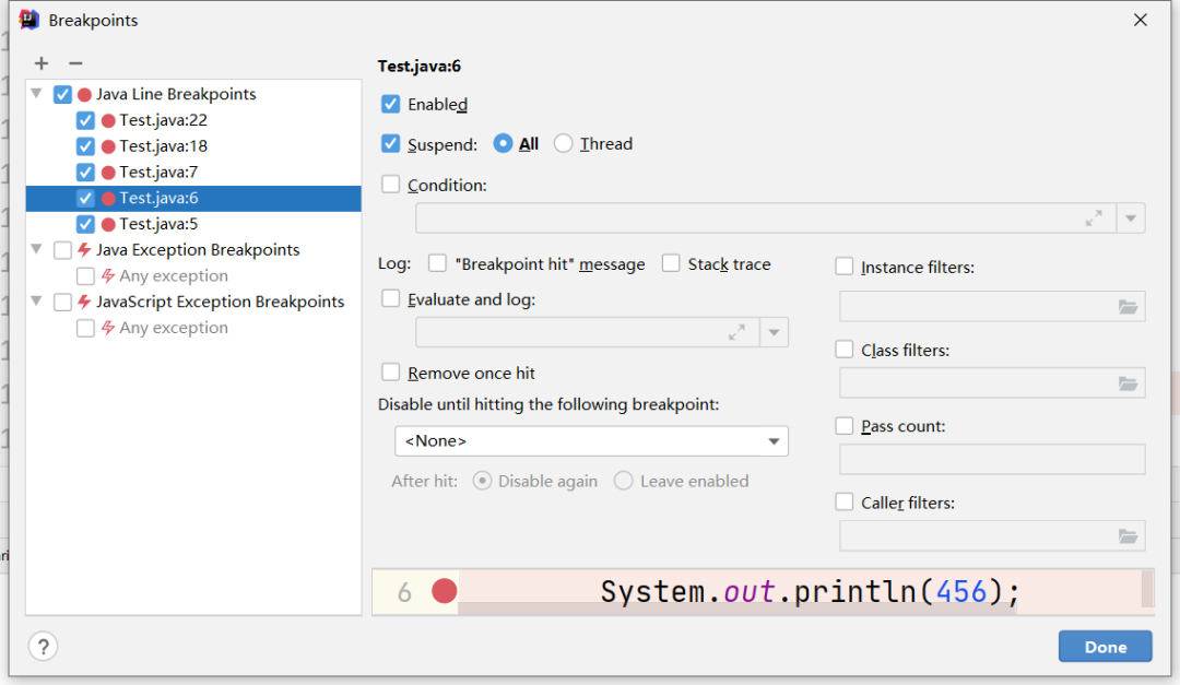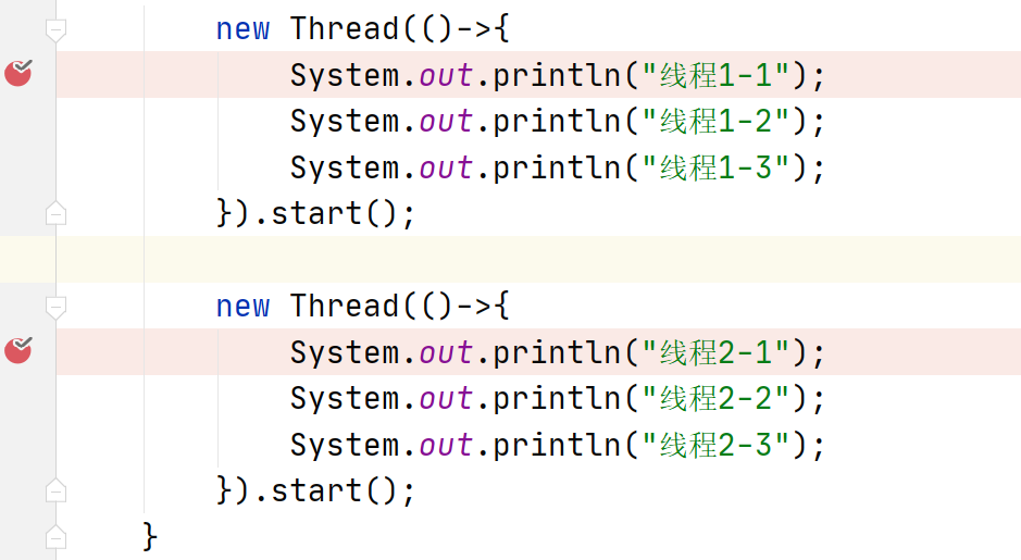 如果我们希望按照 线程1-1,线程2-1,线程1-2,线程2-2,线程1-3,线程2-3 的顺序输出,可以通过设置断点执行顺序来实现,具体操作如下所示。