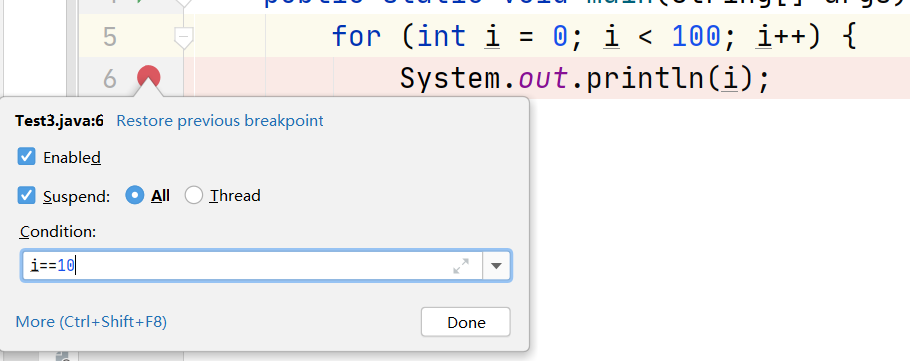 如果我们在这个循环中打断点,那么每次执行循环都会进入断点,我们可以通过设置断点条件来控制是否进入断点,比如只需要在 i = 10 的时候进入断点,则可以在断点处右键,在弹出的对话框的 Condition 中输入条件,如下所示。