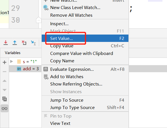 变量 add 的值应该是 3,我们可以手动修改它的值,在控制台的 Variables 中选择 Set Value,具体操作如下所示。
