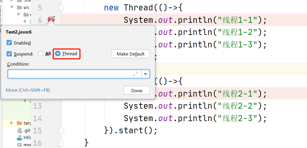 先在两个线程代码中打断点,然后在断点处右键,设置为 Thread,如下图所示。