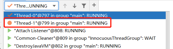 接下来执行程序,进入断点的时候,通过切换当前线程来实现交替执行,比如第一次执行为 Thread-0,那么接下来就切换到 Thread-1 执行,然后再切换到 Thread-0 来执行,如下图所示。